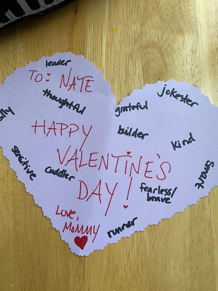 Last year, I just wrote things I love about each of my family members on a paper heart and stuck it somewhere they would see it in the morning. Here’s the one I made for my son: